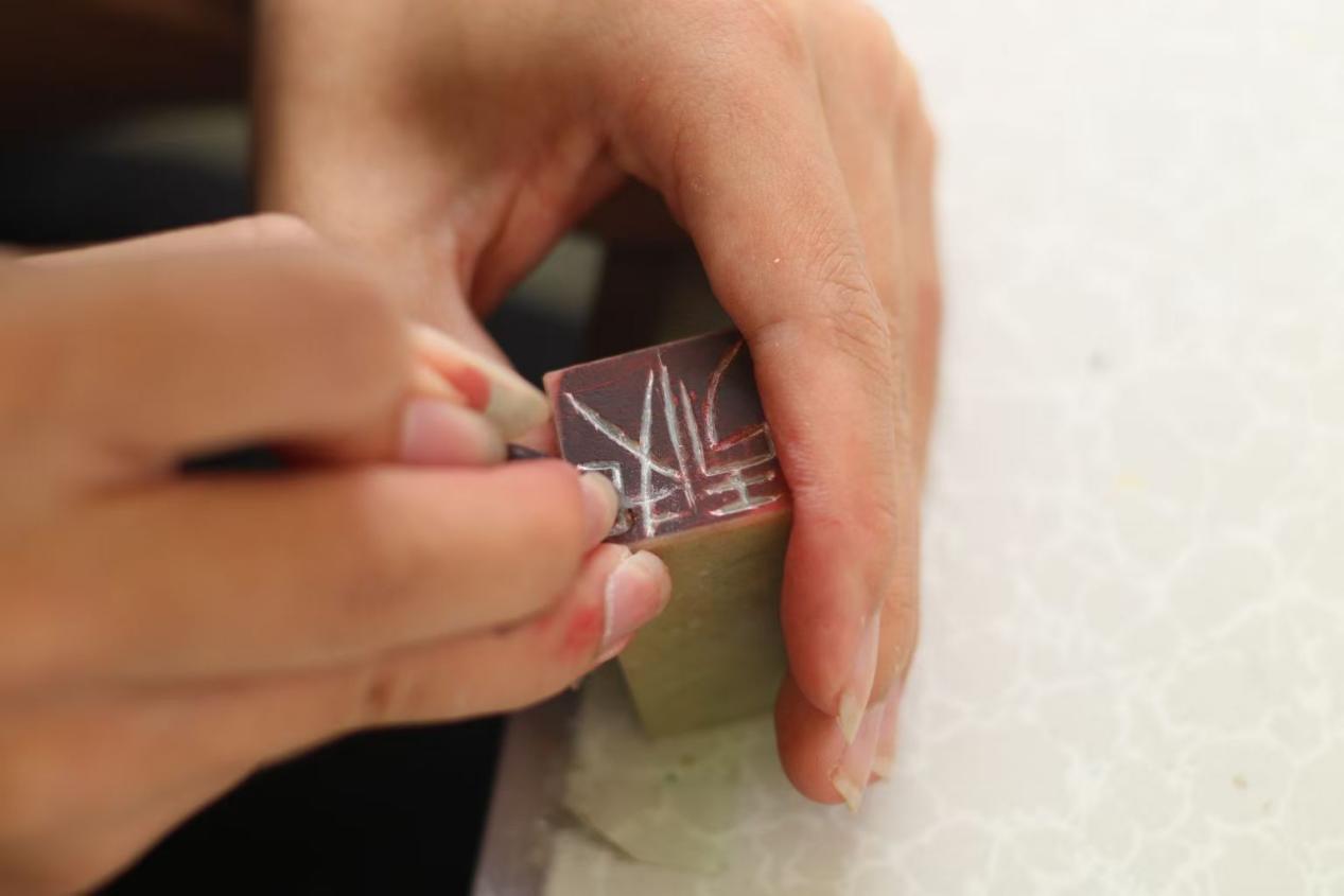 活动伊始,同学们围坐研读篆刻资料,深入了解篆刻艺术的发展脉络。从明清时期的兴盛,到融合书法、绘画、雕刻的独特艺术特质,篆刻所承载的中华文脉与东方审美让大家真切感受到传统艺术的博大精深。指导老师从篆体临摹、印石打磨到运刀技巧,耐心逐一讲解,同学们手持刻刀,在印石上小心落刀,每一刀雕琢都凝聚着对艺术的敬畏与热爱。